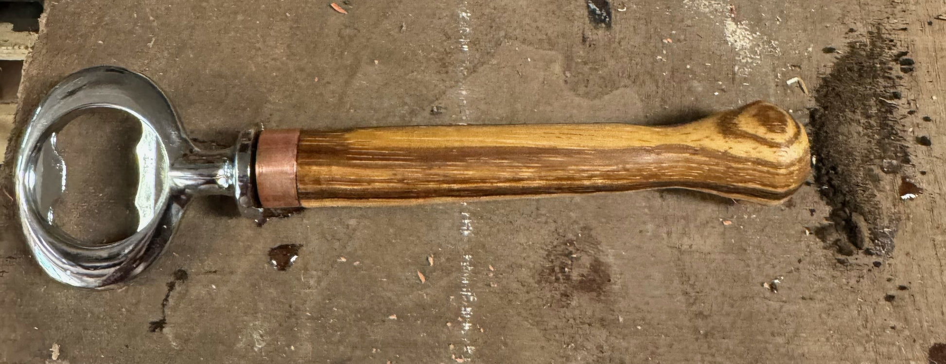 Lathe turned handle made out of domestic or exotic woods for a bottle opener with a metal top.