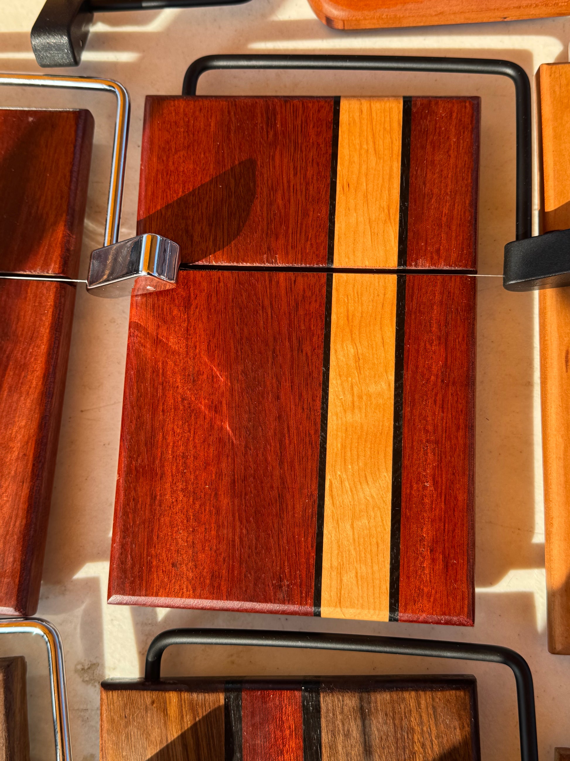 Bloodwood cheese cutter with wenge and maple stripes at 3/4 thick an approximately 6-10 inches in length and 5 3/4 inches wide. Comes with either chrome or flat black handle.
