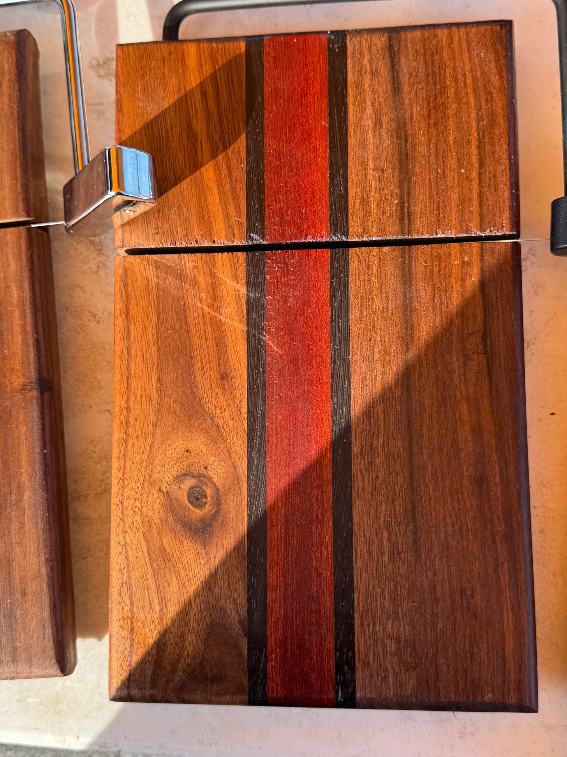Walnut with wenge stripes and bloodwood. 3/4 thick approximately 6-10 inches in length and 5 3/4 inches wide