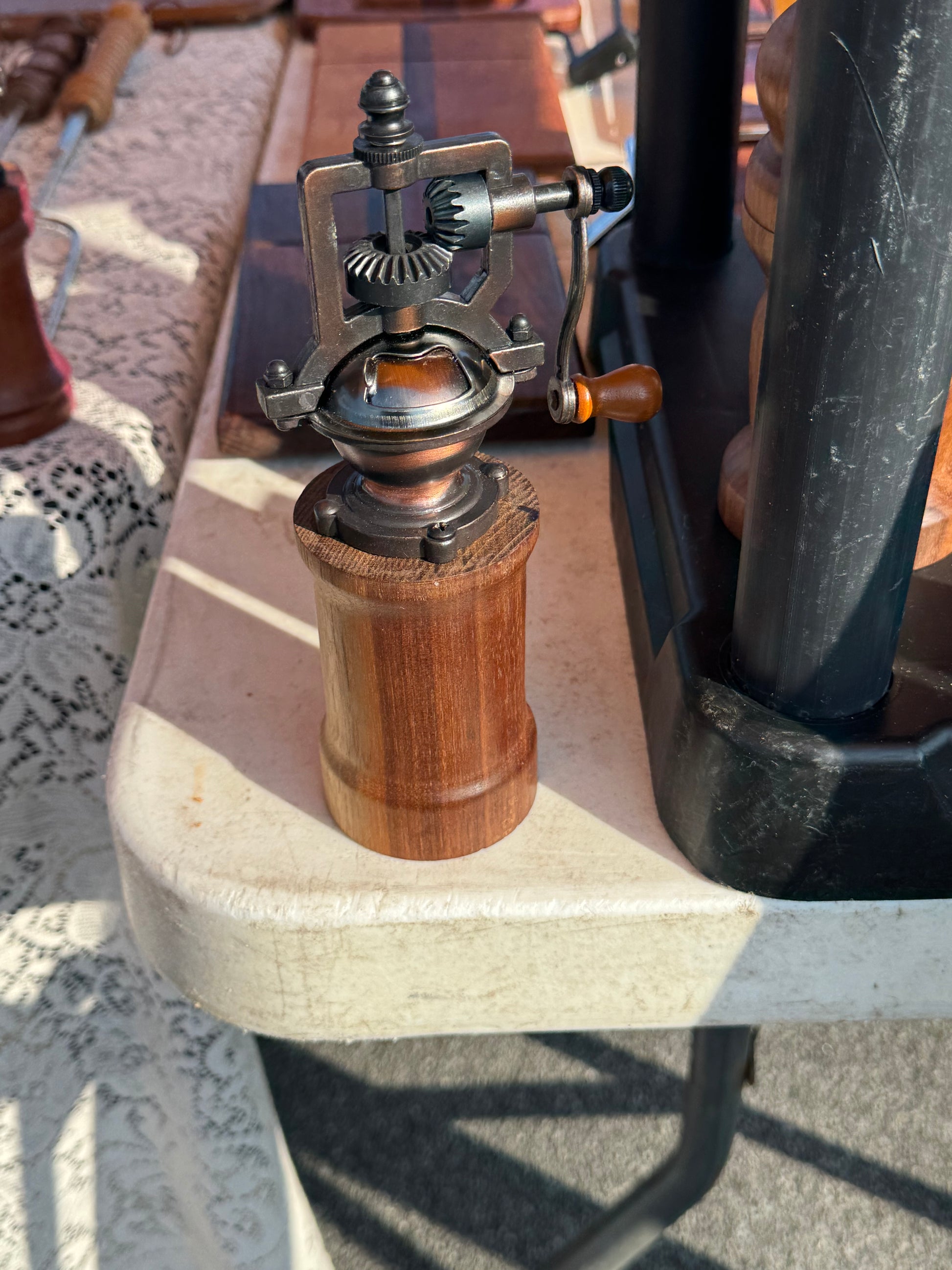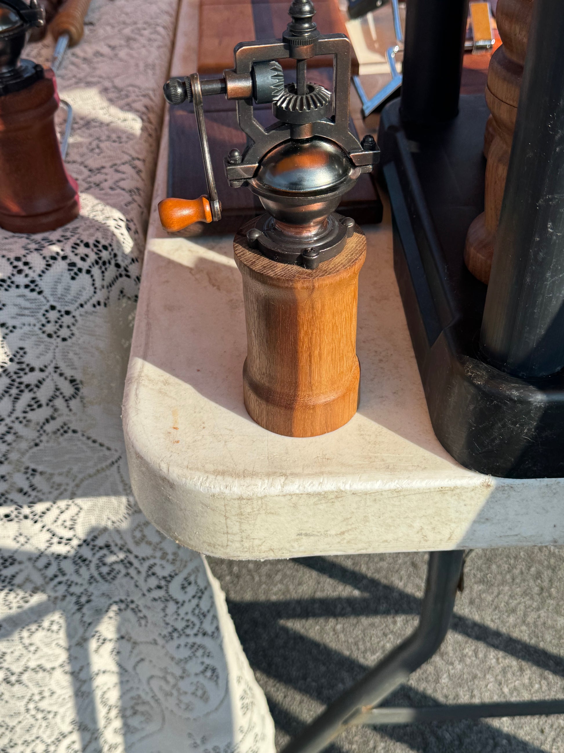 Antique style pepper grinder hand turned from walnut. Approximately 5-6 inches in height and 2-2.5 in diameter.