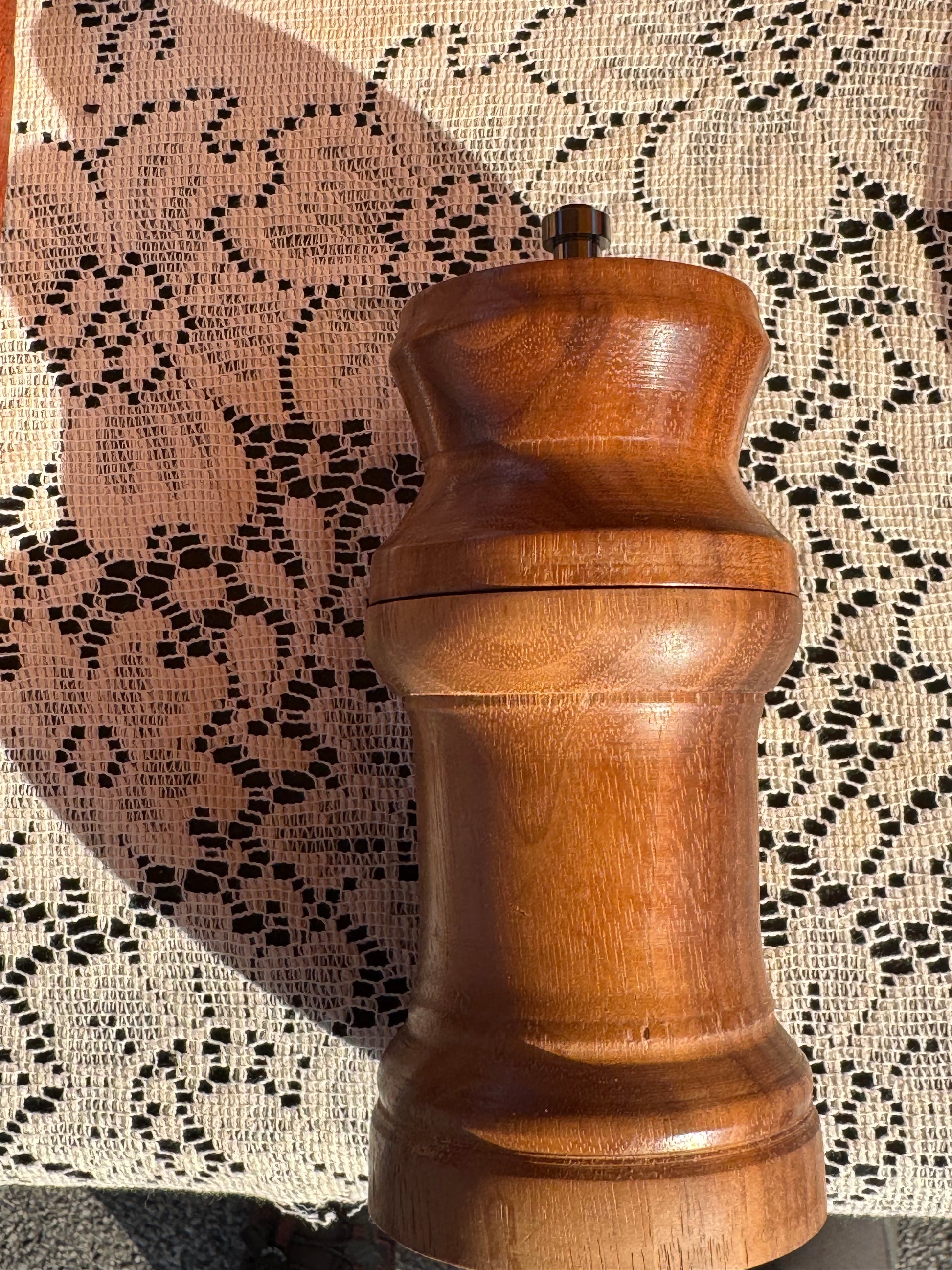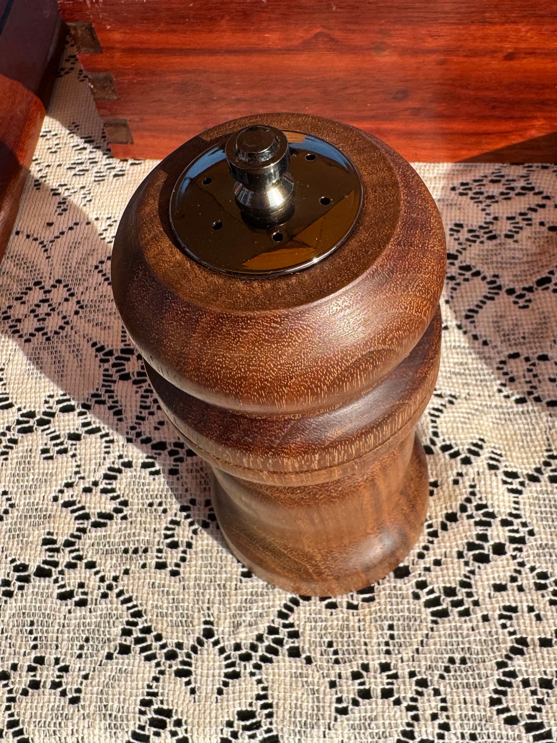 Walnut 2- 2.5 inches in diameter and approximately 5 3/4 height pepper grinder with a salt shake built into the top.