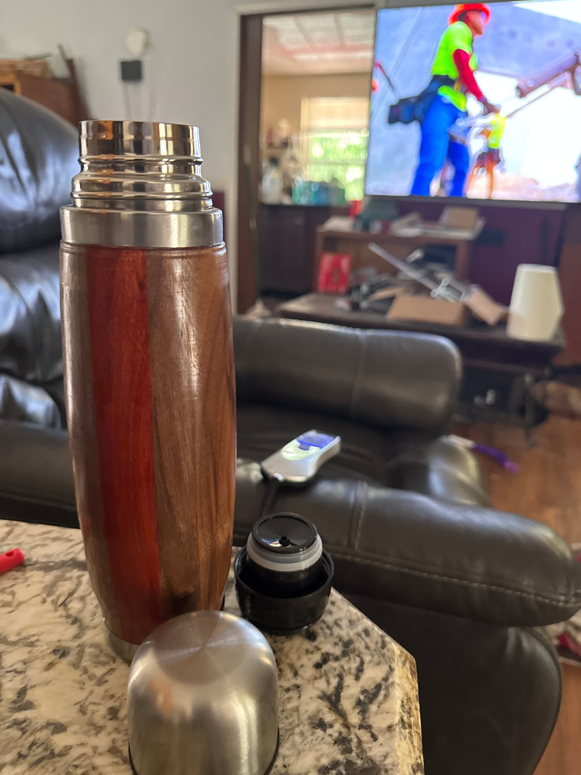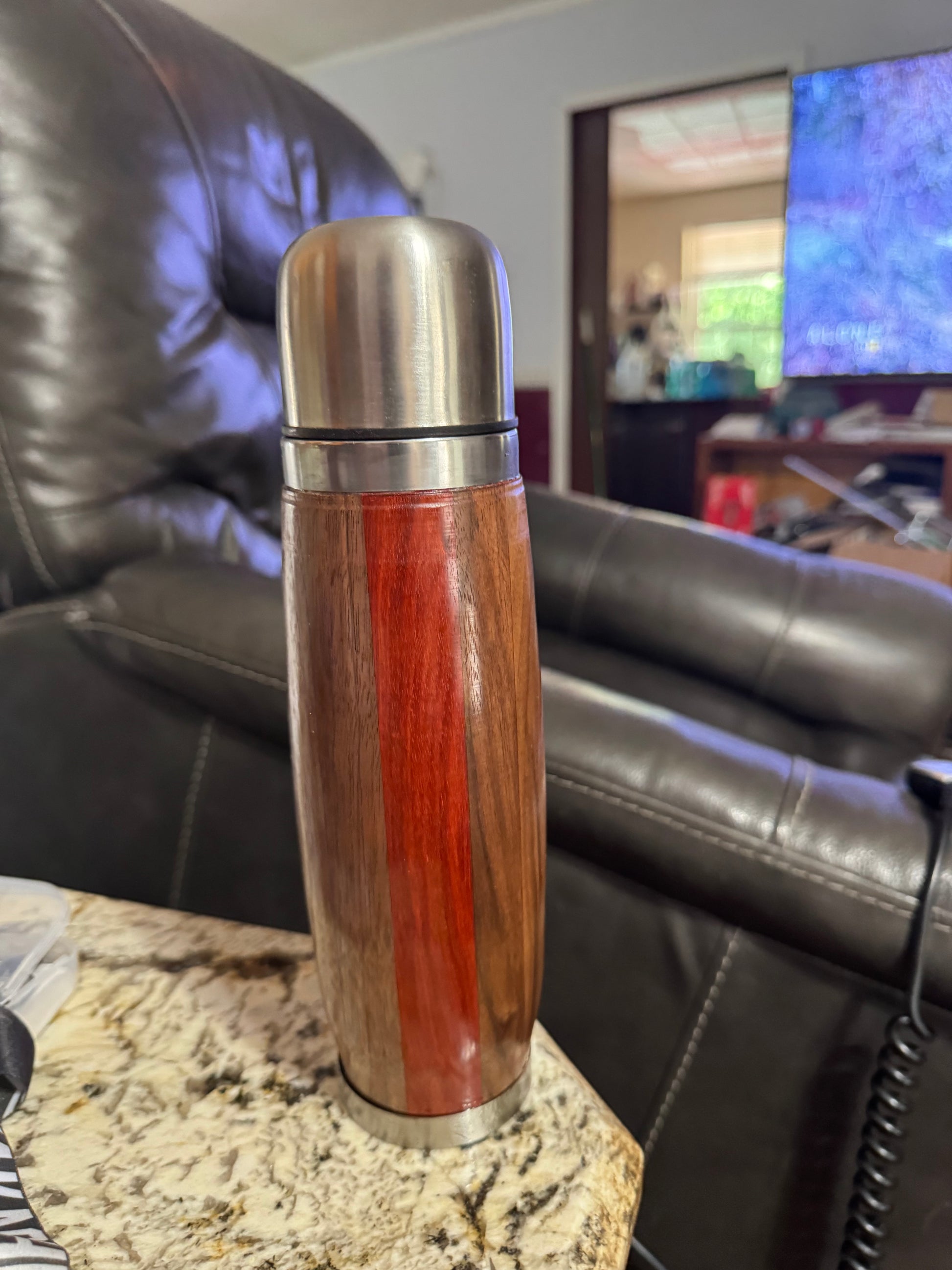 Lathe turned thermos with stainless steel insert and walnut and bloodwood outsides.