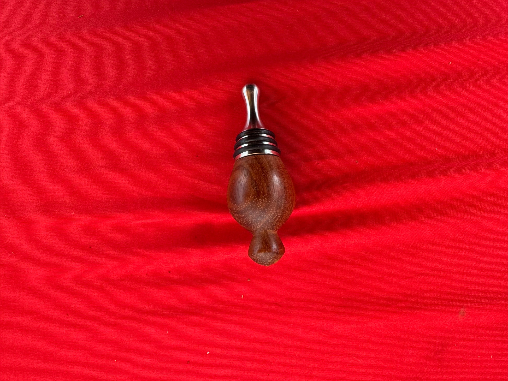 Wine stopper with stainless and silicone tip made from bloodwood in the shape of a rook.